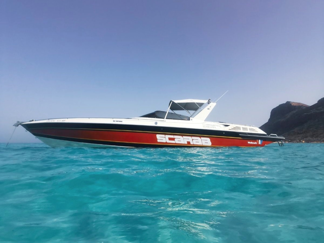 A unique Speedboat 25" Charter to Rodopou Peninsula and Menies Beach in western Crete, Chania region. Explore the rocky terrain through the sea and dive to secluded beaches. Enjoy a fabulous day aboard. The surrounding area is suitable for a day boat adventure and nothing reminds one of being in touristic Crete.