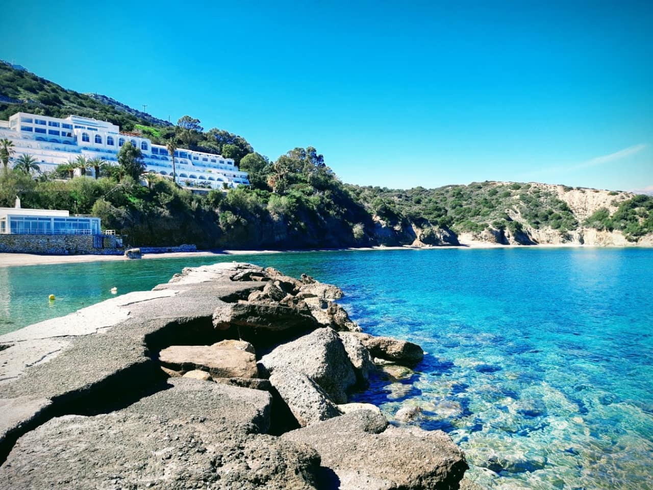 - Beach: A 600 m long beach secluded and protected from intruders, mostly with white sand and pebbles. Small jetty for the boats of the hotel and guests.