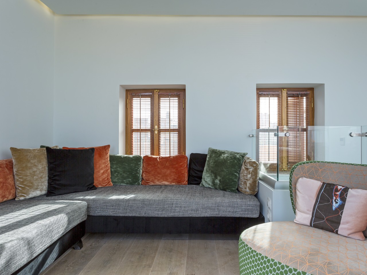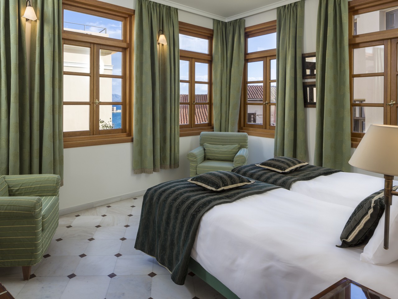 - Presidential Suite (up to 5 people - 82m2): This lavishly designed, the split-level suite offers maximum privacy in a contemporary setup. Its jewel is a private terrace with a fabulous vantage point of the Old Venetian Harbor and the sea. Meticulously appointed with bespoke furnishings, this suite reflects the historic location and is an epitome of luxury. The suite features two separate living areas and can sleep up to 5 people. The bathroom is lined with Greek marble and features a separate walk-in shower and a bathtub.