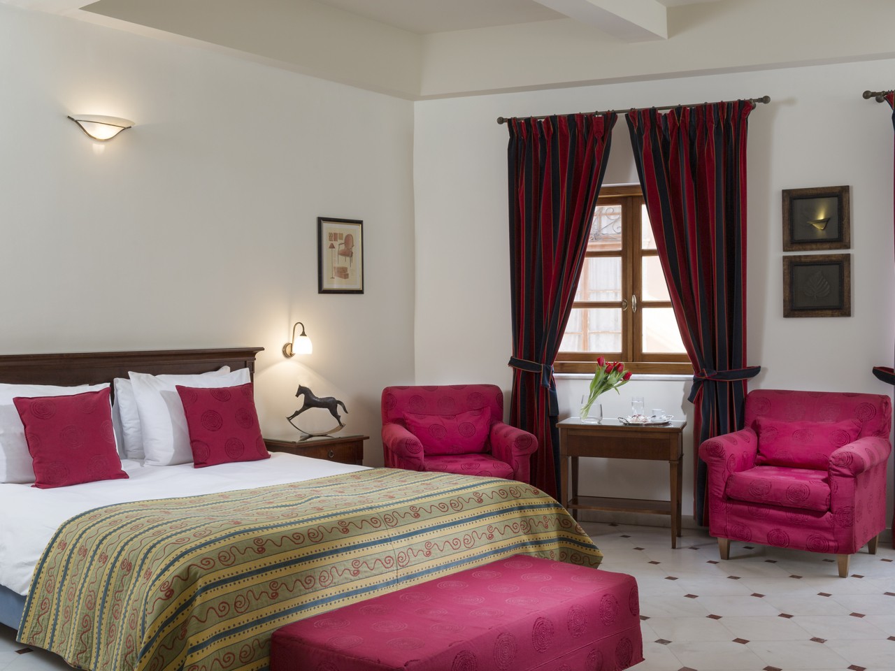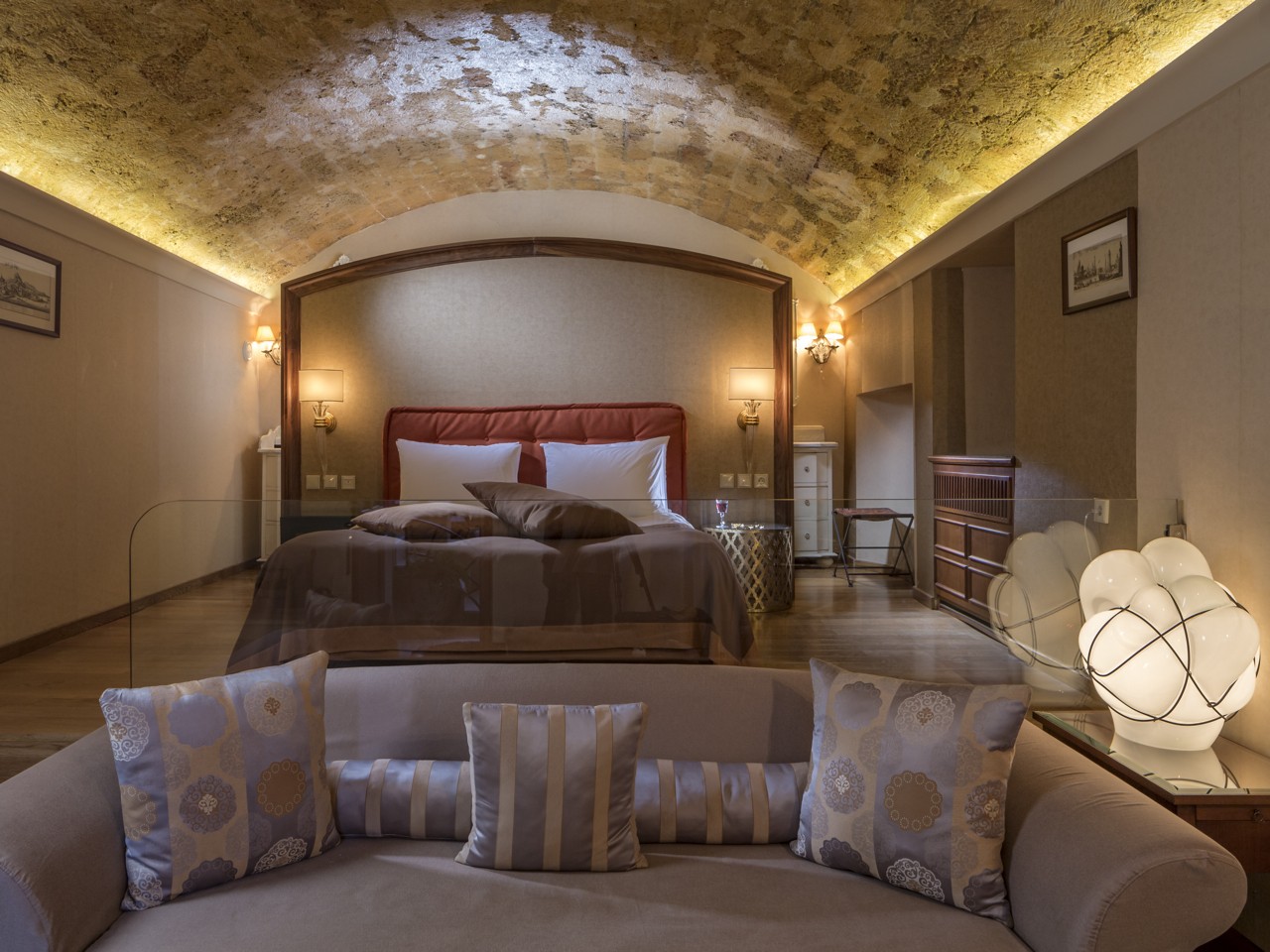 - One-bedroom Suite (up to 4 people - 43m2 ): These suites represent a graceful style and sophistication, with a distinct character and alluring charm. Some on one level or split-level, providing a refined environment that combines simplicity and comfort. They feature double/queen beds or twin beds, and most of them have a lounge area, where the sofa can be converted into a single bed. Some of them have a small balcony overlooking the courtyard or the narrow alleys of the Old Venetian Town. They all have marble-tiled bathrooms, with either a (Jacuzzi) bathtub or a walk-in shower.