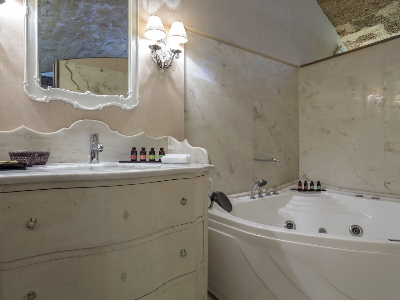 - Master Suite (up to 4 people - 62m2): A very spacious suite, which includes an elegant living area, as well as a separate dressing room. The bedroom, which opens onto the courtyard, features a vaulted ceiling and exposed stonework. Concealed behind the king-size bed is a large Jacuzzi. The second bedroom has two twin beds and a bathroom (with a shower). A door separates the master bedroom from the second one for optimal privacy.