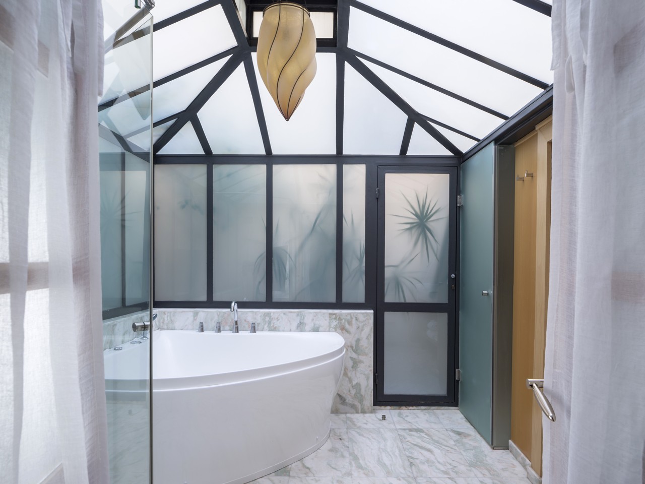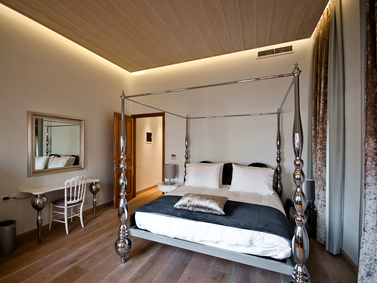 - Romantic Suite (up to 4 people - 58m2): This cozy, romantic loft-style suite has been decorated with romance and luxury in mind. A unique feature is a conservatory-style bathroom, with a shower, double sink, and deluxe Jacuzzi with hydro-massage and ozone therapy. The snug bedroom with a king-size bed is located on the mezzanine, along with a second bathroom (with shower). On the lower level, there is a relaxed living area with a writing desk and two sofa beds.