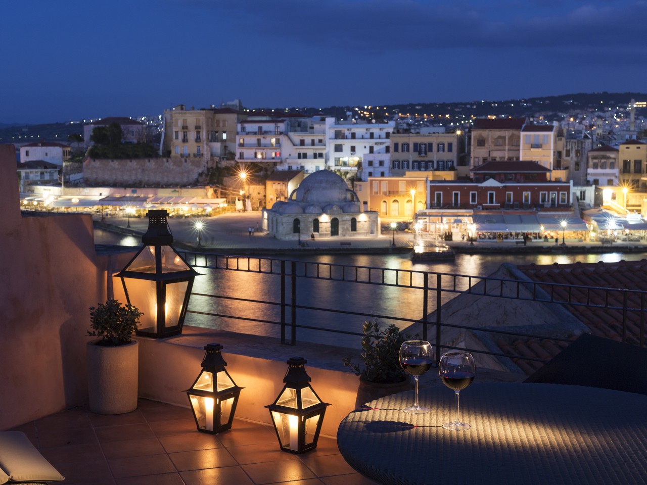 Casa Delfino’s spectacular roof terrace features a lounge bar, a hot tub, and a shaded seating area. Relax and enjoy commanding views from the majestic White Mountains to the sea. This is surely Chania’s most glamorous setting for sundowners or for those who wish to enjoy a cocktail and a light appetizer, high above the hustle and bustle of the harbour.