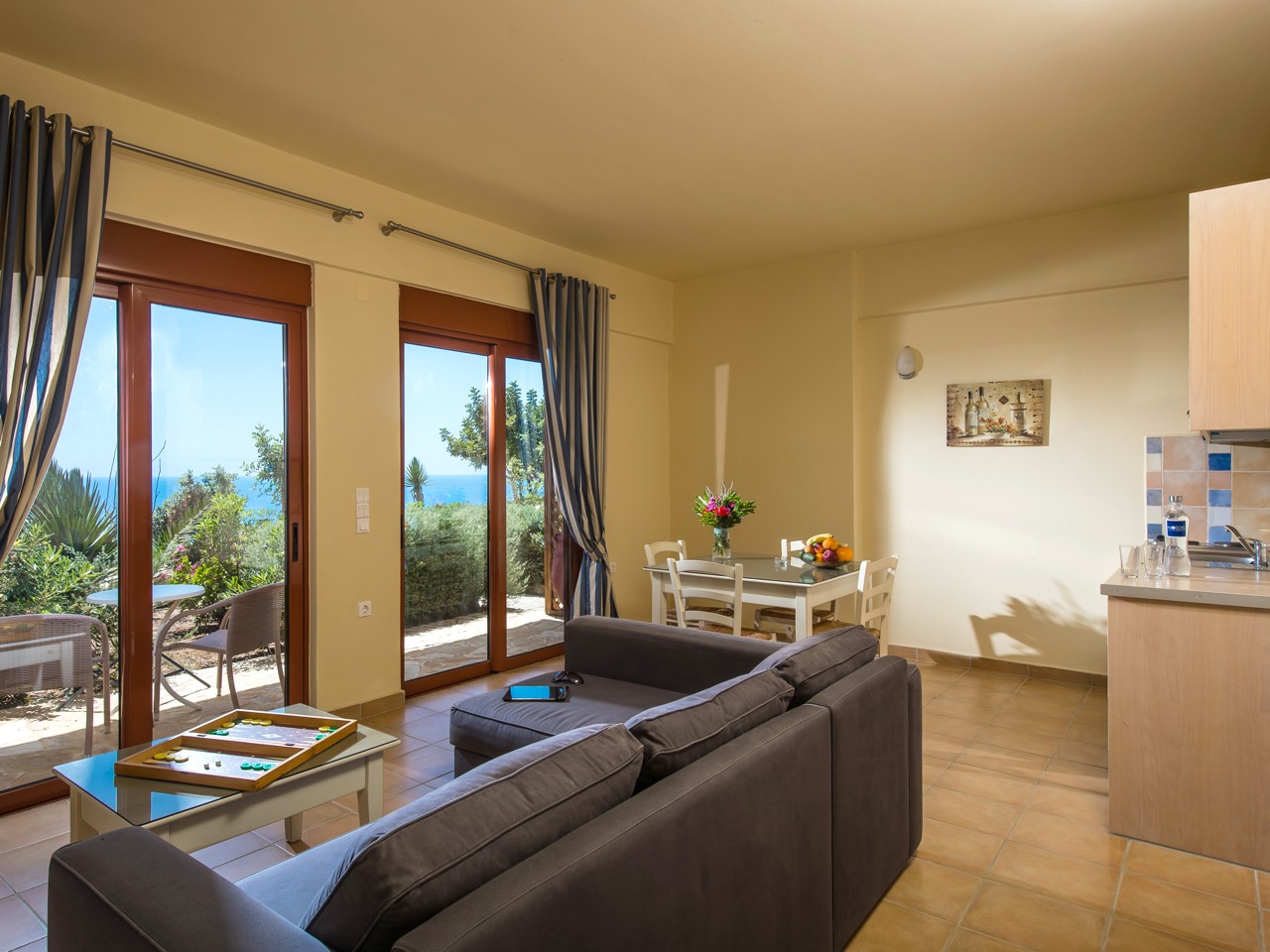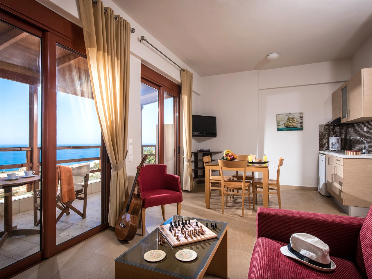 - Studios of 40 m2 with 12 m2 balconies fully equipped including a sleep sofa to sleep up to four people. Featuring a kitchenette and a dining area, these tastefully decorated studios overlook the Cretan Sea from its balcony. Bathroom with shower. It also includes a TV, DVD player and air conditioning.