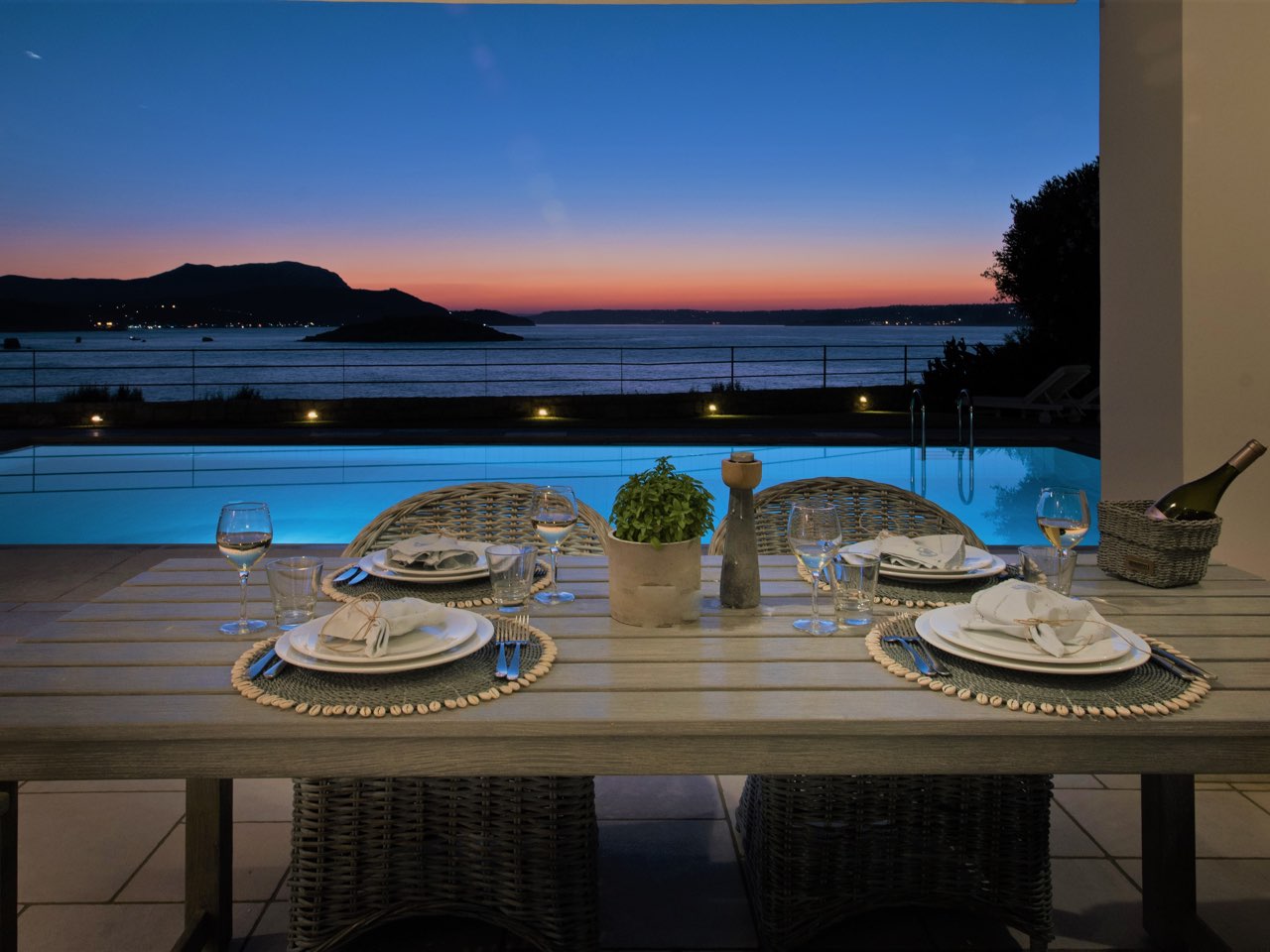 Private swimming pool with stunning views, Outdoor dining area, verandas and balconies, Wooden patio with sunbeds, Wooden patio with pergola and big sofas overlooking the sea and the garden, Parking area for 2 cars, Automatic night lighting, Remote control entrance gates.