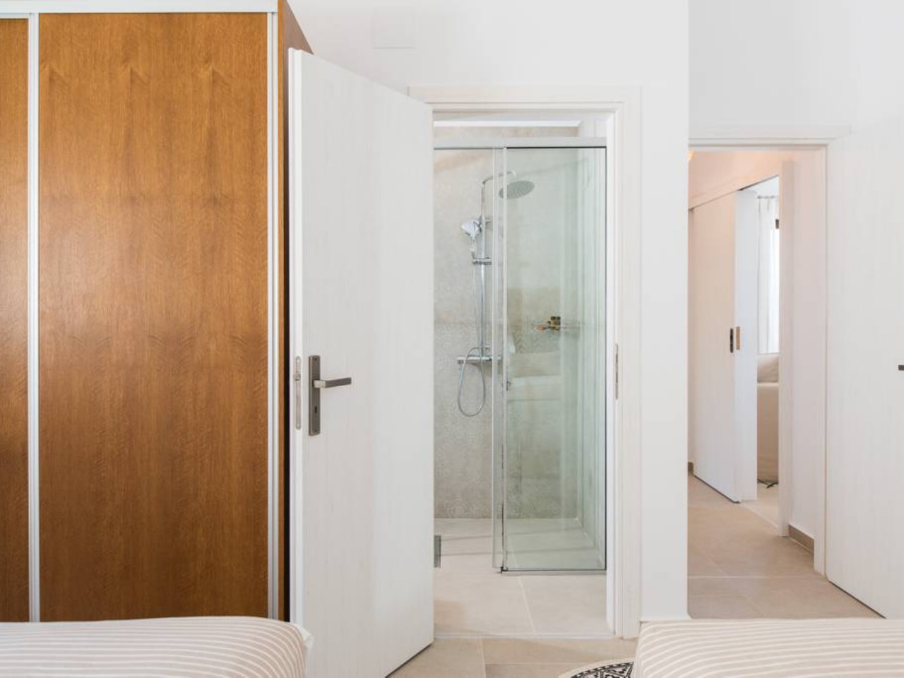 Bedroom nr. 3 has two twin beds size 0.90m x 2m which can be combined to a double bed. This bedroom has its bathroom in the hallway.