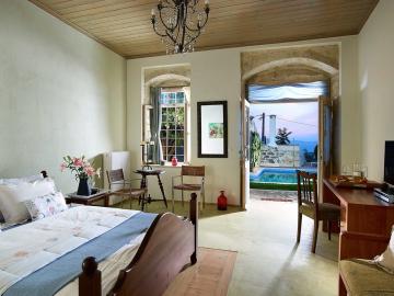 Five rooms and two suites, superb hospitality, delicious dinners, a swimming pool, and fantastic views in the wine-making heartland of Crete.