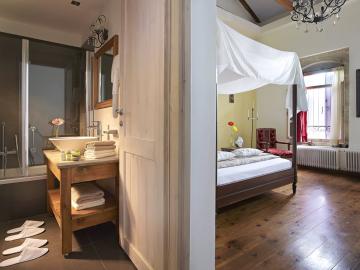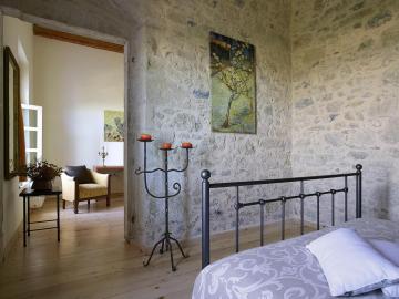 The spacious and luminous 5 Double Rooms and 2 Suites are furnished and decorated with taste. The presence of the stone, the wood, the high ceiling, and the candles provide a warm atmosphere. Most have light-wash colored wood-beamed ceilings. 2 Double Rooms are on the ground floor, the other 3 Double Rooms and 2 Suites on the first floor.