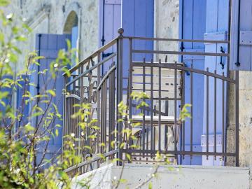The entrance area leads, via its salvaged ancient iron railing, upstairs to the bedrooms. Two rooms on the ground floor are entered from the outside terrace on the ground level by the main entrance front door. All rooms have a double bed.